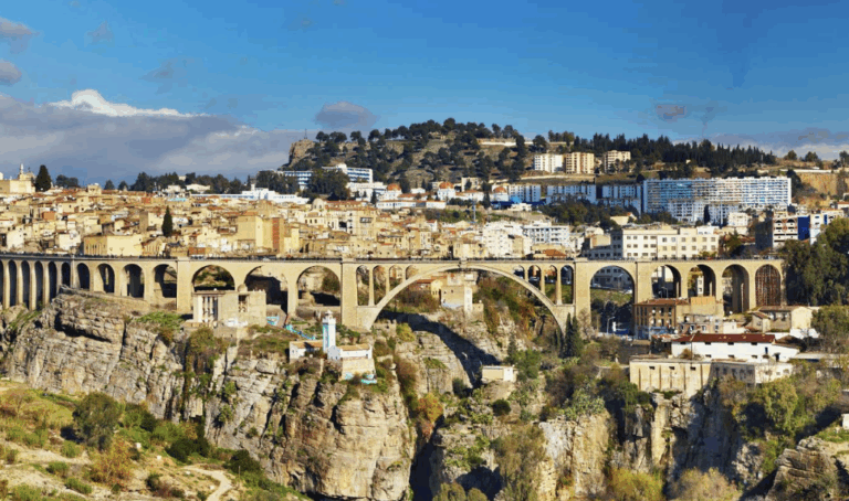 Constantine, la cité des ponts suspendus, est l’une des villes les plus anciennes et les plus fascinantes d’Algérie. Elle se distingue par son architecture unique bâtie sur des rochers vertigineux, reliés par de nombreux ponts historiques qui lui ont valu le surnom de “ville des ponts”. Constantine n’est pas seulement un paysage naturel spectaculaire, mais aussi un centre culturel et civilisationnel riche, qui a accueilli savants et artistes à travers les âges, et qui regorge de palais, de mosquées anciennes et de marchés traditionnels. La visiter, c’est entreprendre un voyage au cœur de l’histoire et du patrimoine algérien.